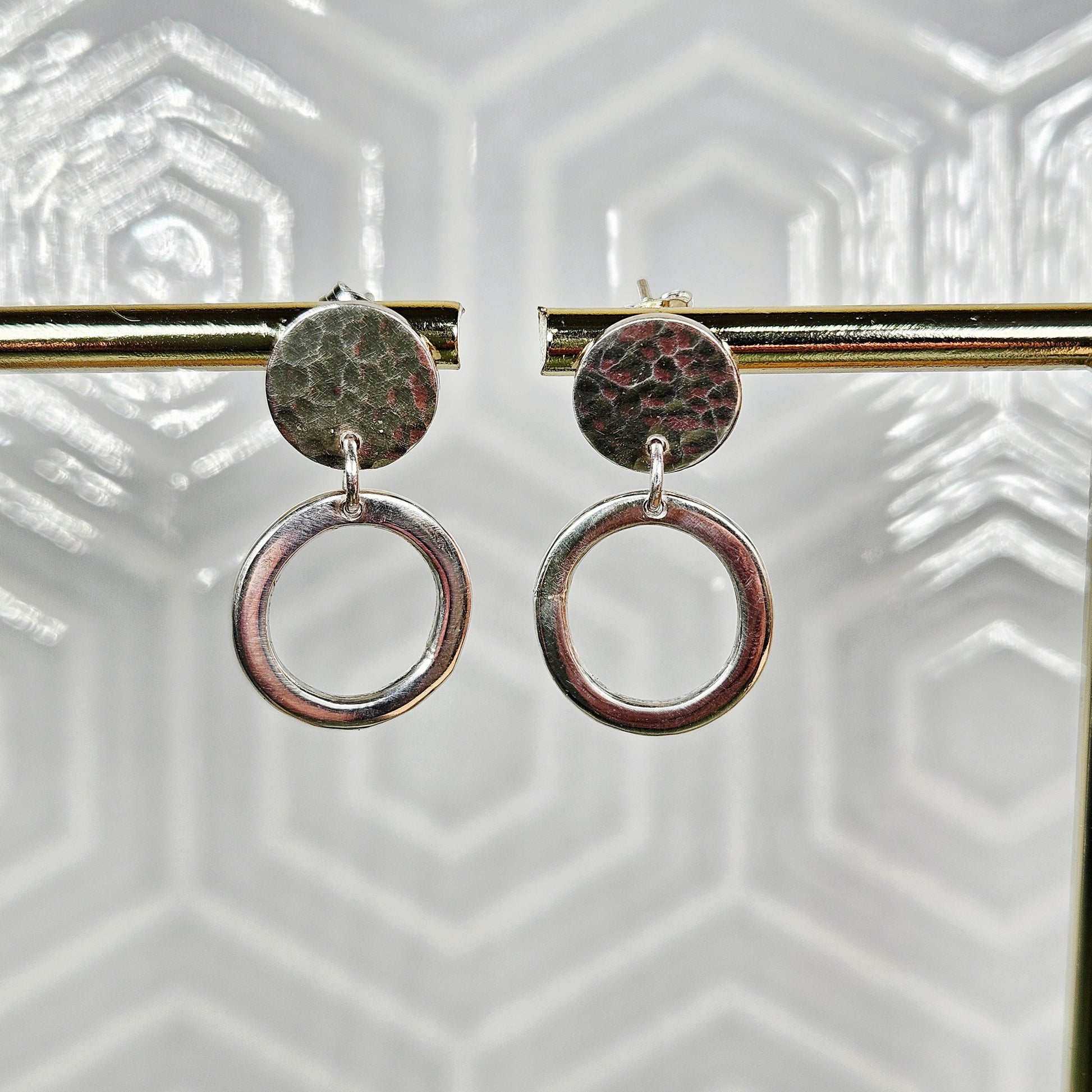 Sterling silver stud earrings, with small silver disc with hammered effect and a rustic circle dangling below. Fastened with small butterfly backs