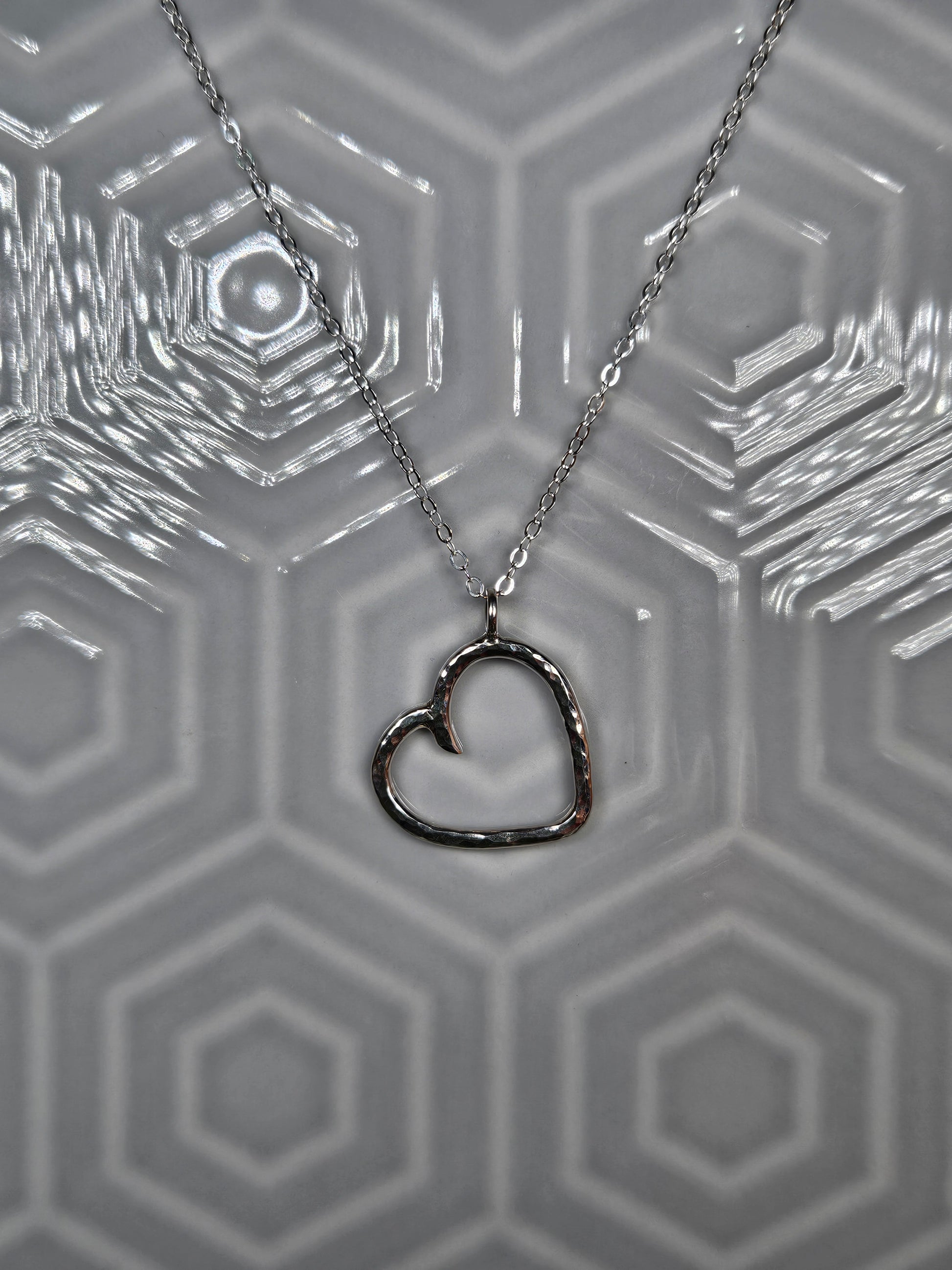 Hammered heart frame pendant, made from 2mm sterling silver wire hand formed into a heart shape and hammered for a glittering texturing. On a 16" sterling silver belcher chain