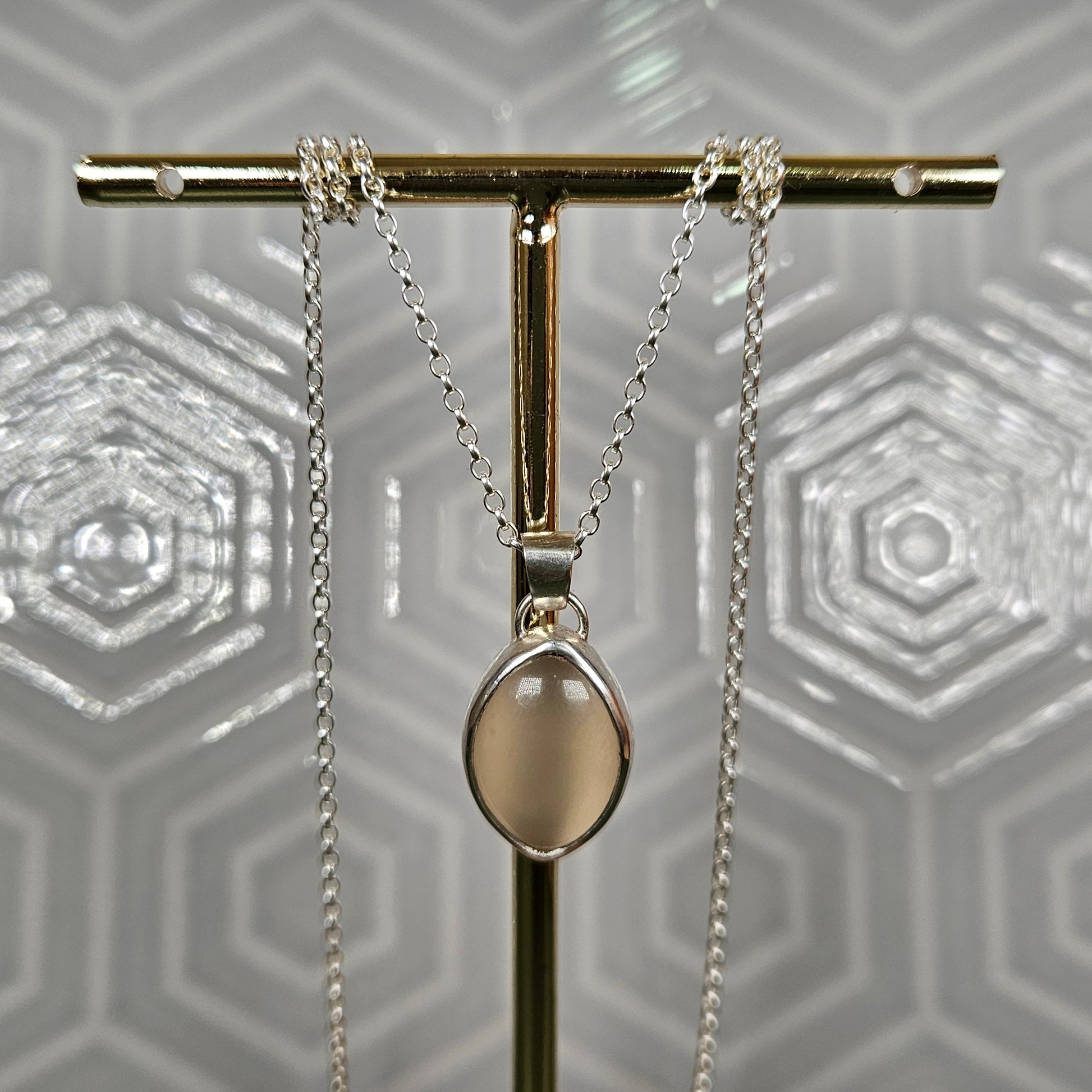 Striking white moonstone marquise cabochon bezel set pendant, strung on an 18" sterling silver oval belcher chain