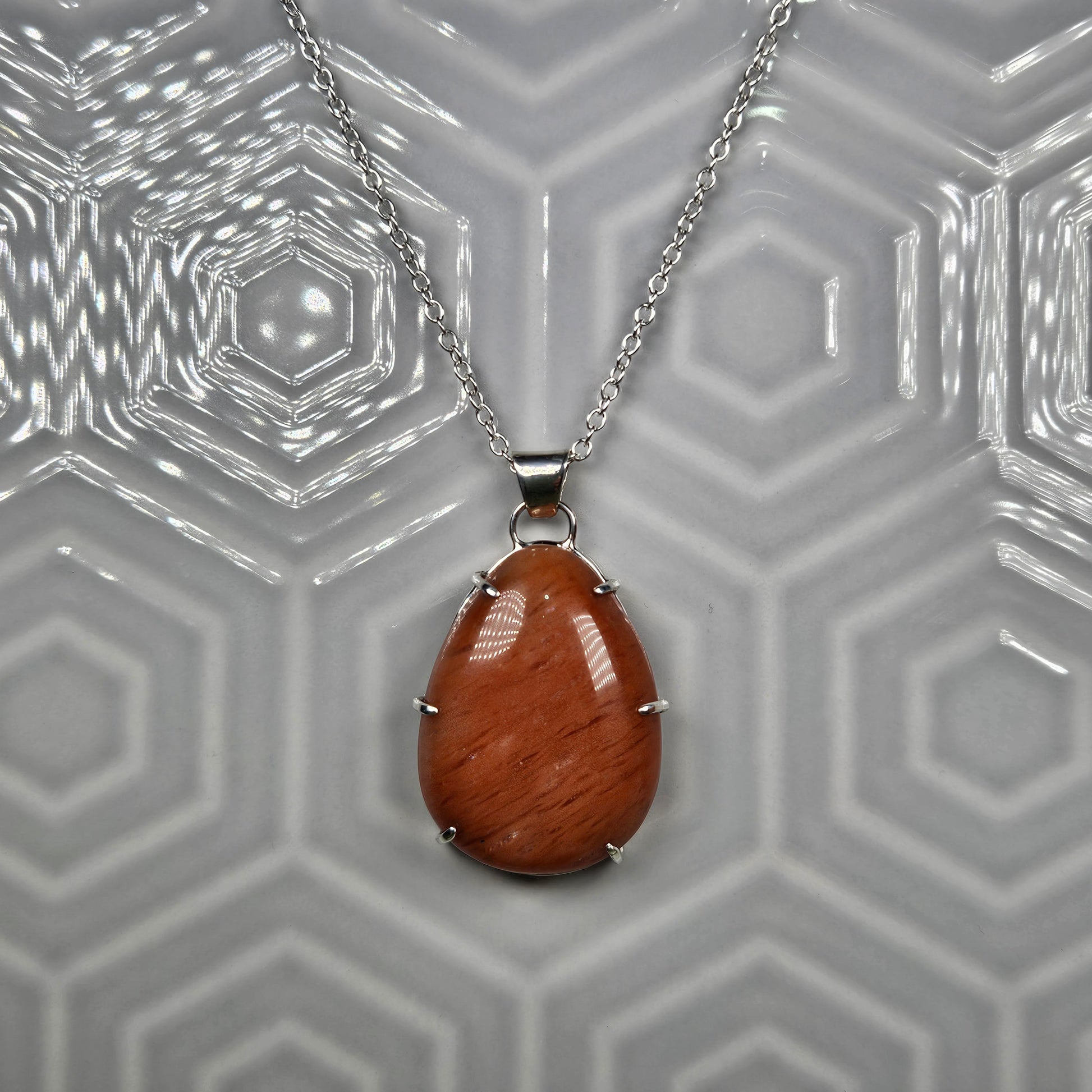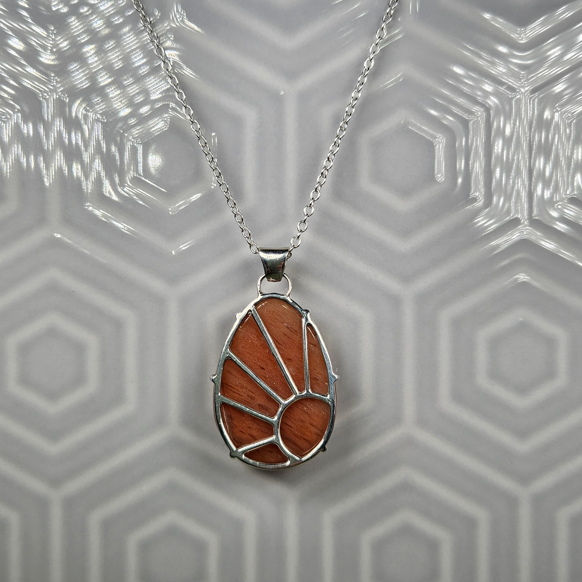 Striking Orange Onyx teardrop cabochon prong set pendant, with silver sun-rays on the rear, and strung on 20" sterling silver trace chain